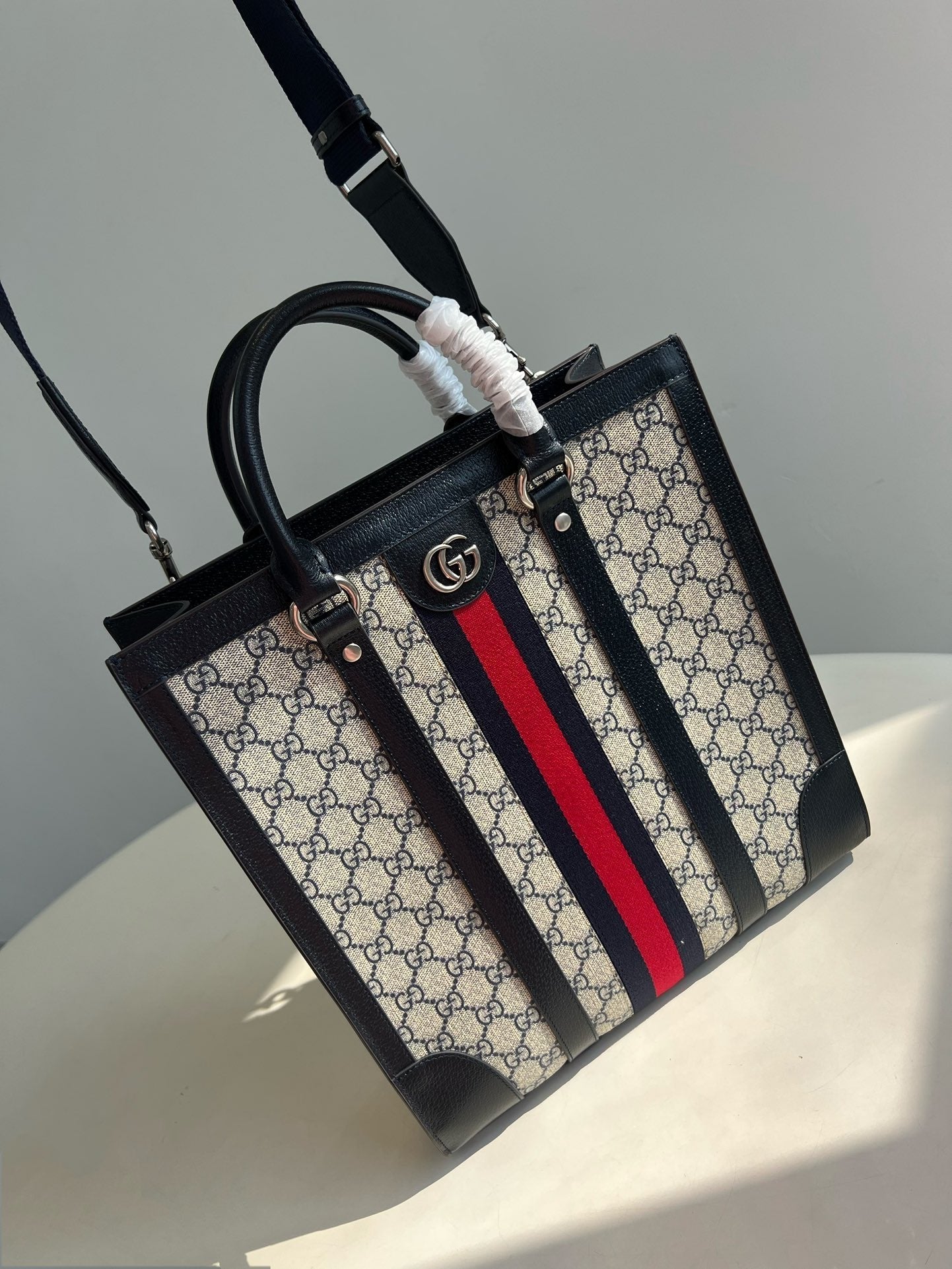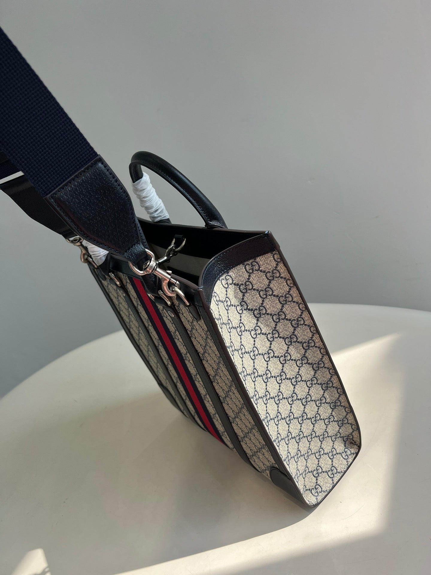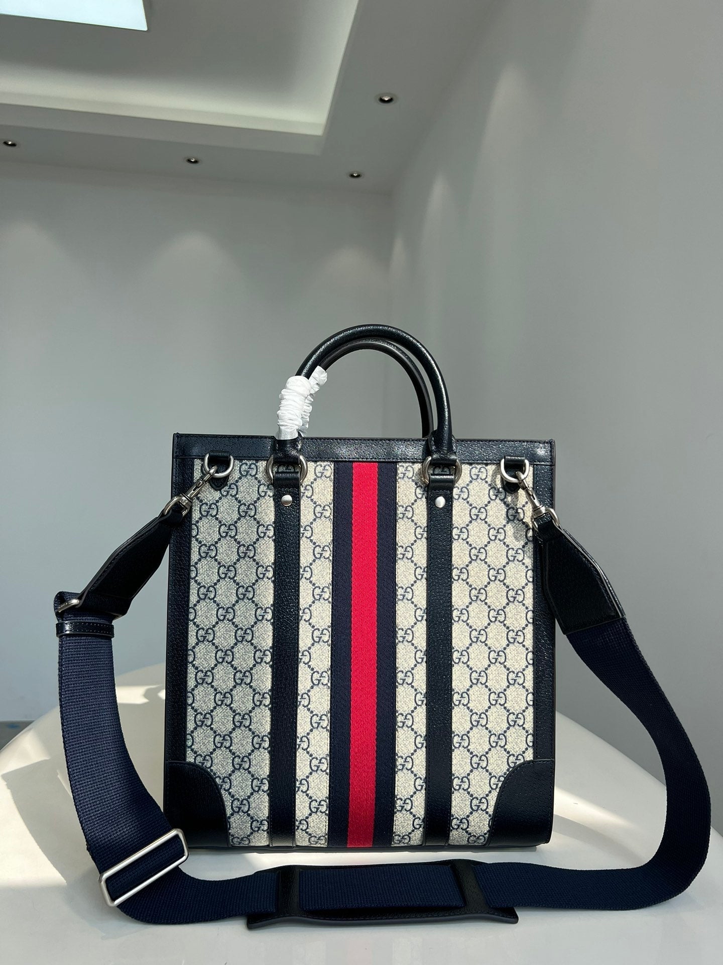 The latest Presbyterian medium men's Tote bag shopping bag, handbag single shoulder crossbody bag, the new Tote bag, a very large one, boxy bag type, very atmospheric senior, the bag body is made of canvas material, easy to collect and easy to take care of, super durable, feel very good, do not worry about scratching. And this time the canvas material is more wear-resistant and three-dimensional, the classic double G presbyched pvc with cowhide trim, a particularly simple bag. The front is matched with classic red and green belt/red and blue belt elements, vintage and fashion coexist, the workmanship is very exquisite, and the old metal color is very retro. Open hook opening and closing design, there is a zipper pocket and sticker bag inside, large space, the capacity is quite strong, there is no pressure to install a file, notebook, tablet and so on. In addition to the fixed leather handle, there is a removable and adjustable wide shoulder strap with padded shoulders. The hand and shoulder are super stylish, and the classic never goes out of style. It is very suitable for men to commute to use, it will be more fashionable than the traditional briefcase, the overall presbytery design and color matching will not be very flamboyant, very durable and fashionable atmosphere, must be arranged for your boyfriend or husband