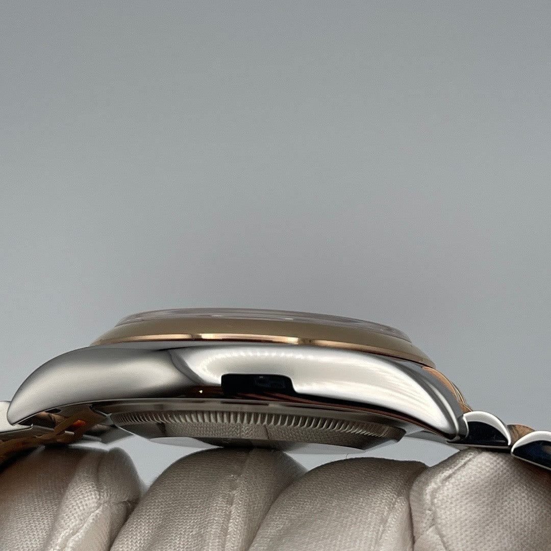 The 2025 Watch Datejust is designed with a 36mm polished stainless steel and rose gold case. highlighted by a smooth rose gold dome bezel. It features a rich black dial with luminous hour markers and hands. and date display at 3 o'clock protected by a scratch-resistant sapphire-crystal. This elegant timepiece comes on a stainless steel and rose gold jubilee bracelet.