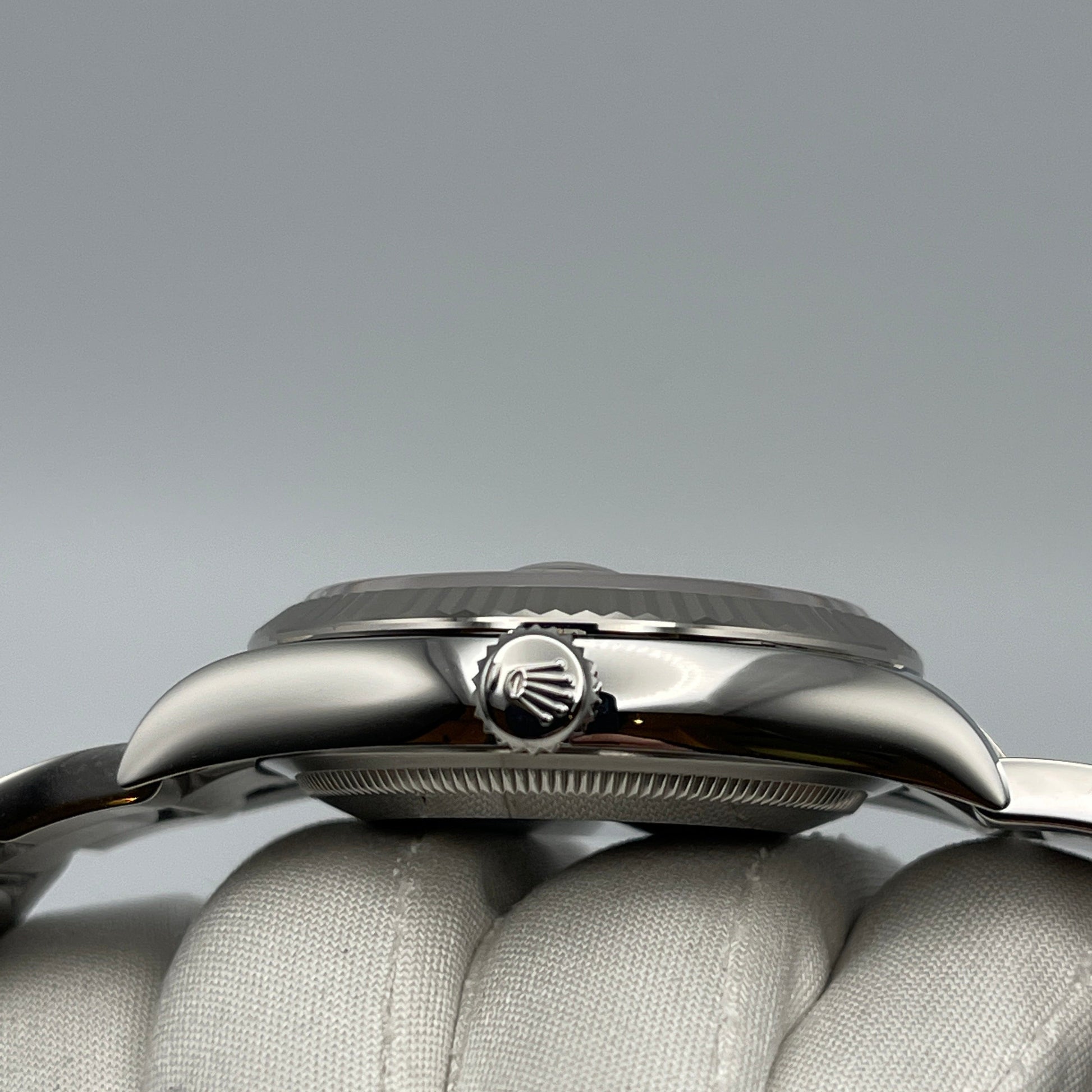 The 2025 Watch Datejust is designed with a 36mm stainless steel and white gold case. highlighted by the distinctive white gold fluted bezel. It features a blue dial with white stick hour markers. white gold hands and a date display at 3 o'clock. protected by a scratch-resistant sapphire-crystal. The stainless steel oyster bracelet is a true beauty.