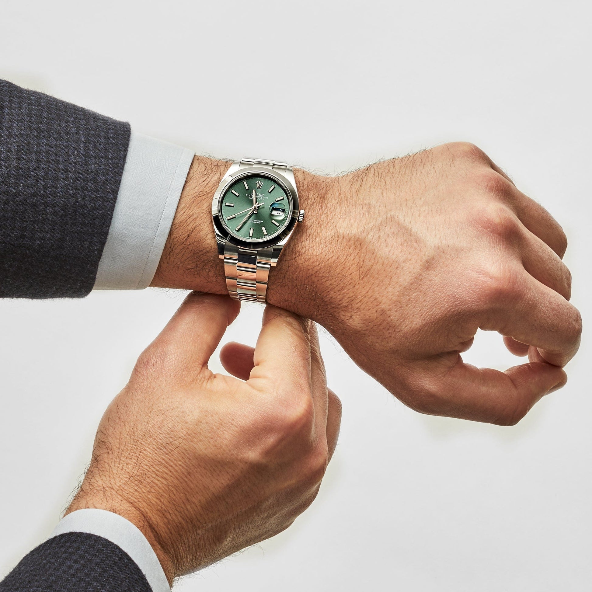 The 2025 Watch Datejust is designed with a 41mm stainless steel case. highlighted with a classic steel smooth bezel. It features a?green dial surrounded by luminous hands and a date display at 3 o'clock. protected by a scratch-resistant sapphire crystal. On the wrist. the stainless steel?oyster bracelet is a true beauty.