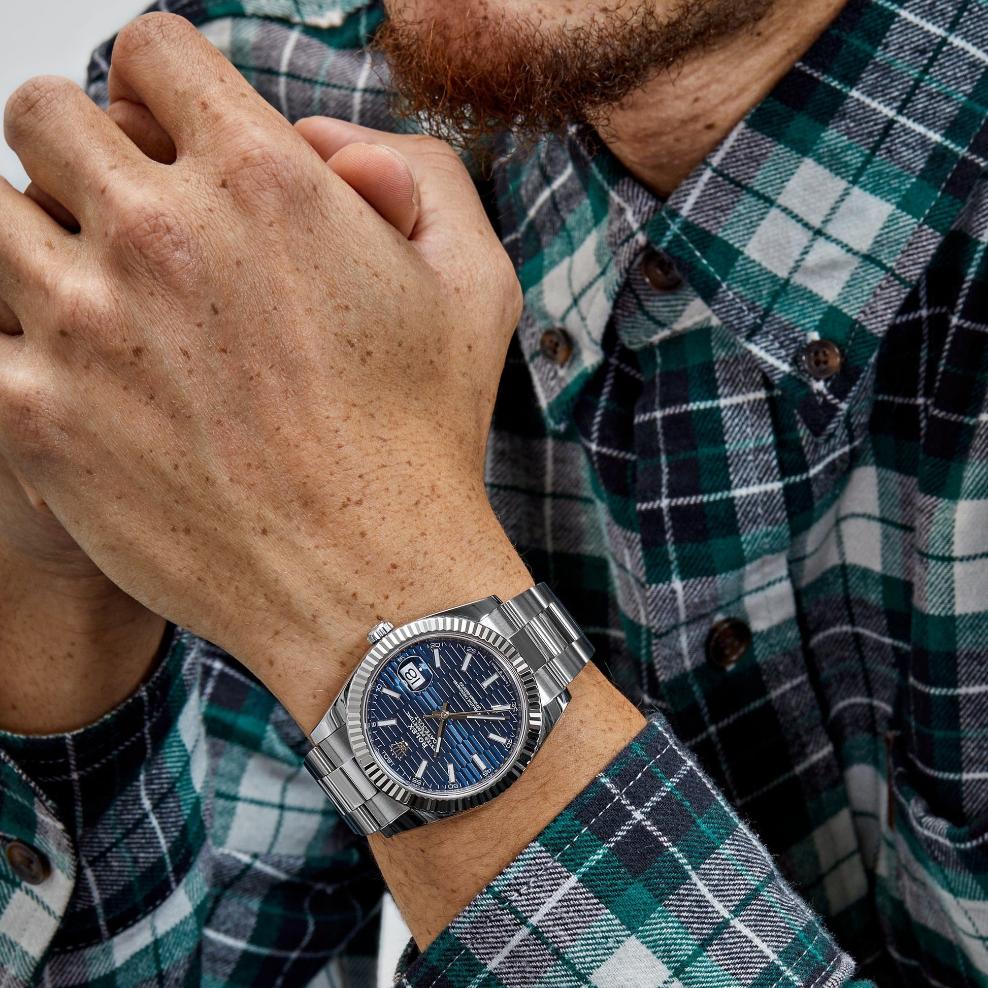 The 2025 Watch Datejust is designed with a 41mm stainless steel case.?complemented by the signature fluted bezel. and styled on a steel oyster?bracelet. The fluted motif bright blue dial features luminescent stick?hour markers and hands and hosts a date feature at 3 o'clock. The 2025 Watch Datejust is a classic model and the next addition to your collection.?