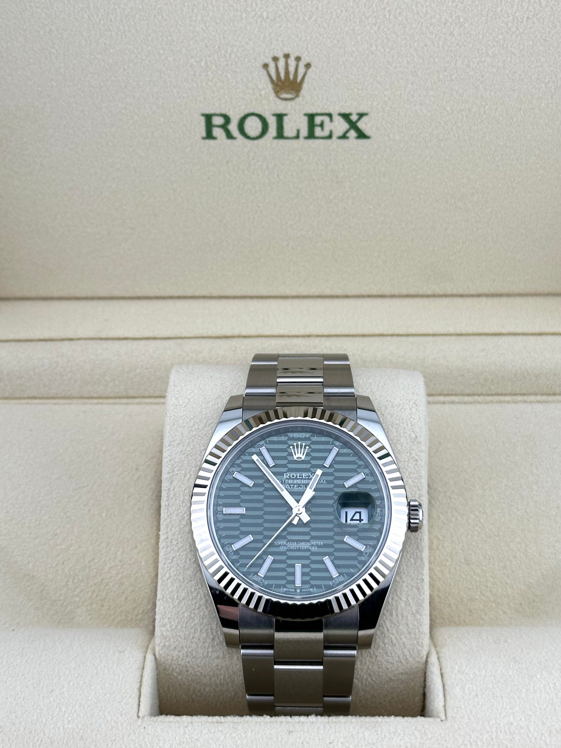 The 2025 Watch Datejust is designed with a 41mm stainless steel case. complemented by the signature fluted bezel. and styled on a steel Oyster bracelet. The green motif dial features stick hour markers and hands and hosts a date feature at 3 o'clock. The 2025 Watch Datejust is a classic model and the next addition to your collection.?