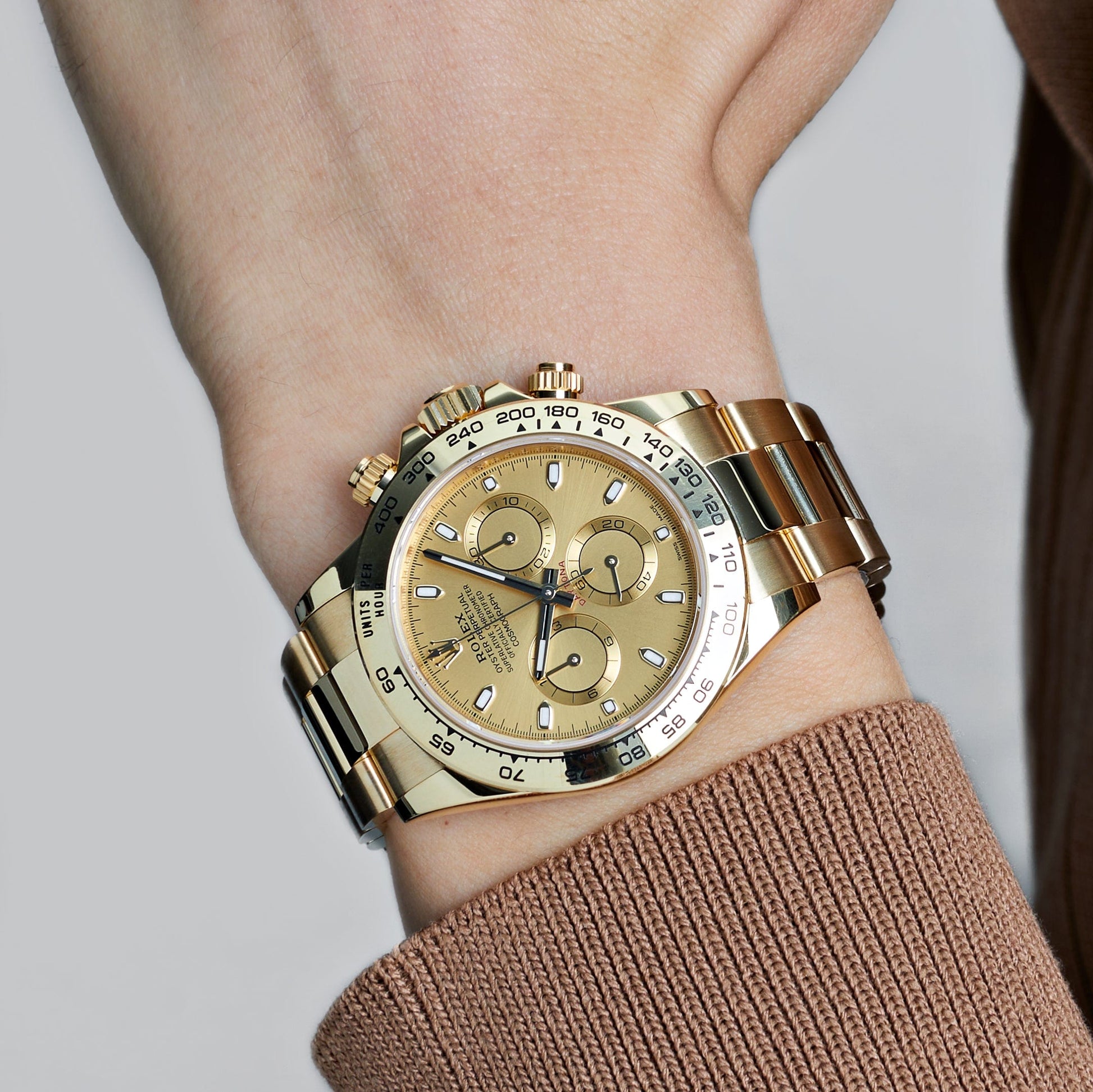The 2025 Watch Daytona 116508 is designed in 40mm 18k yellow gold with a pure champagne dial. Luminous hour markers and hands include a Chromalight display for optimal legibility. The bezel is engraved with a tachymetric scale and hosts the high-performance Chronograph. This 2025 Watch grail can time a speed of up to 400 kilometers per hour and remains seen as the epitome of functionality meeting fashion.
