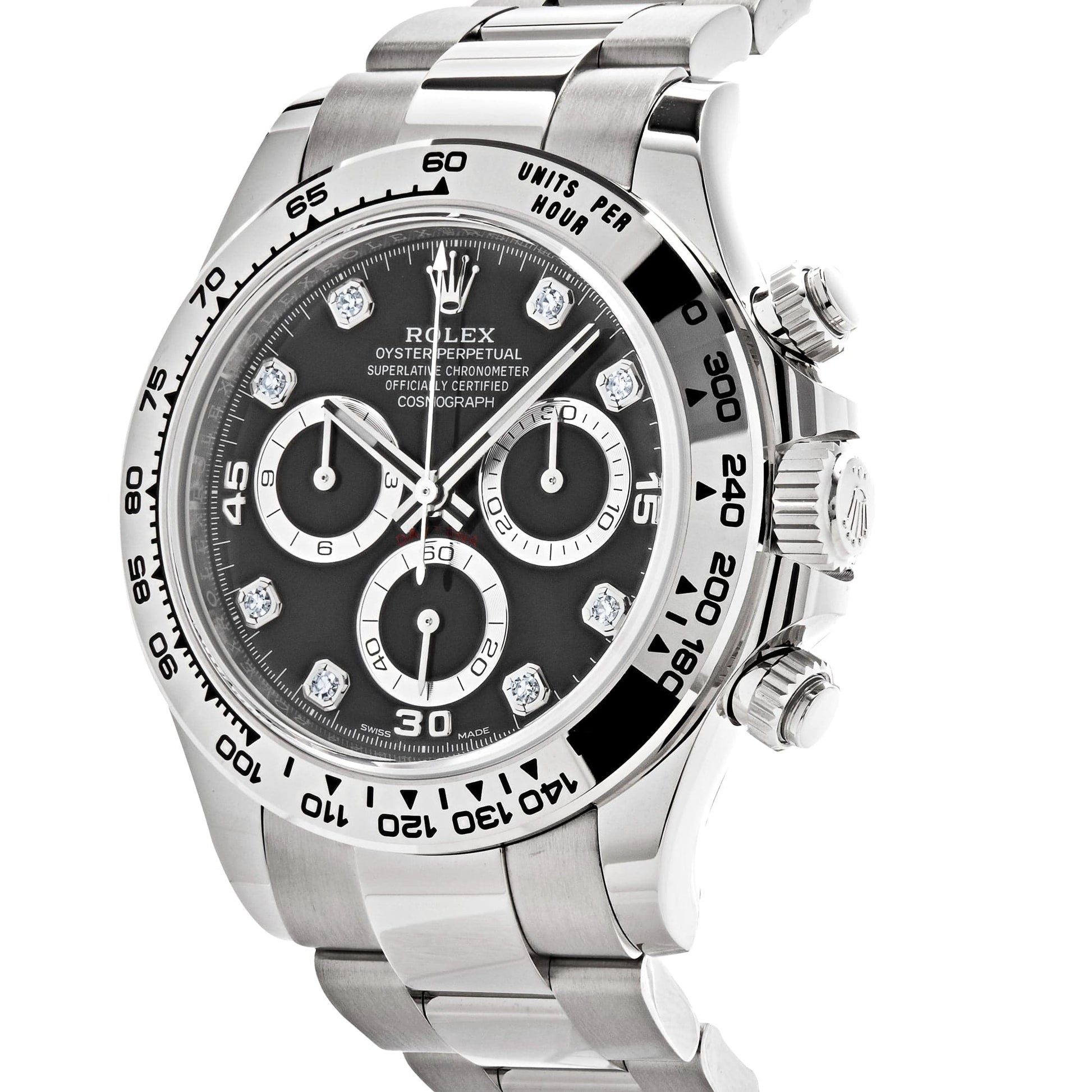 The 2025 Watch Daytona 116509 is designed in 18k white gold with an intense black dial and complemented by diamond hour markers. Luminous hands include a Chromalight display for optimal legibility. The engraved bezel features a tachymetric scale and hosts a high-performance Chronograph with timekeeping capabilities of up to 400 kilometers per hour. With peak performance and hand-selected diamond markers. this 2025 Watch is as sporty as it is sexy.?