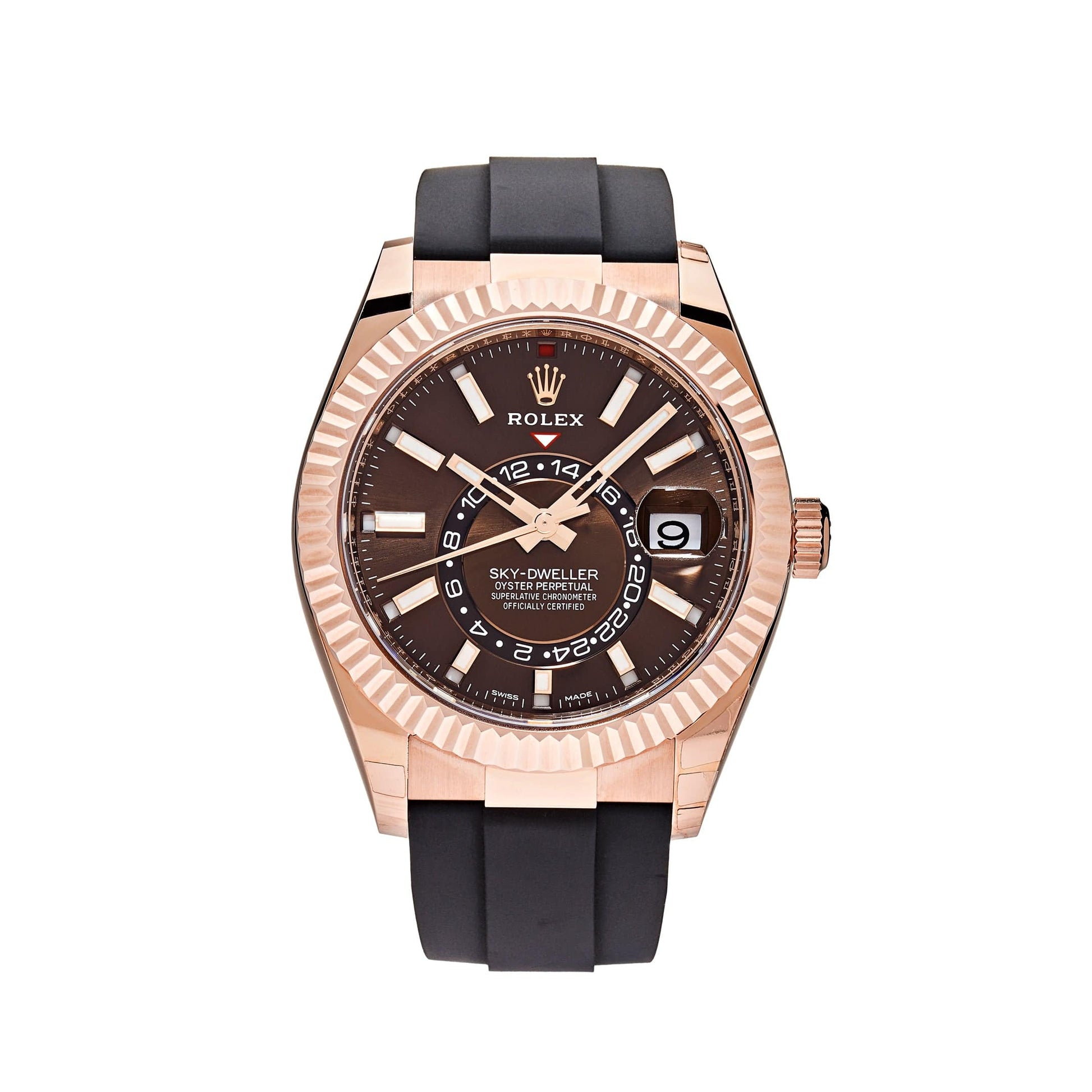 This 2025 Watch Sky-Dweller features dual time zones. inlaid in a 42mm 18k rose gold case and fluted bezel surrounding a brown dial with luminous hour markers. The Ring Command bezel can be rotated to select the date. the local time and the reference time. which can then be adjusted in either direction using the winding crown. The 2025 Watch comes on an Oysterflex bracelet with oysterclasp to ensure flexibility and comfort.?