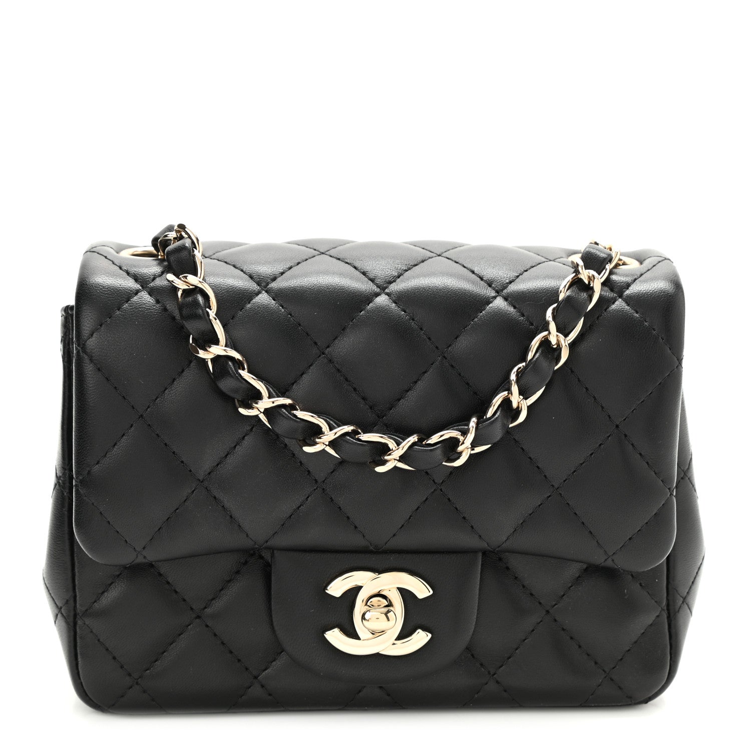 This is an authentic CC quilted mini square flap bag in black lambskin. This classic bag is crafted in luxurious black diamond quilted lambskin. The bag features a back patch pocket and waist-length gold chain link leather threaded shoulder strap with a gold plated CC CC turnlock. This opens the front flap to reveal a black leather interior with zip closure and patch pockets.