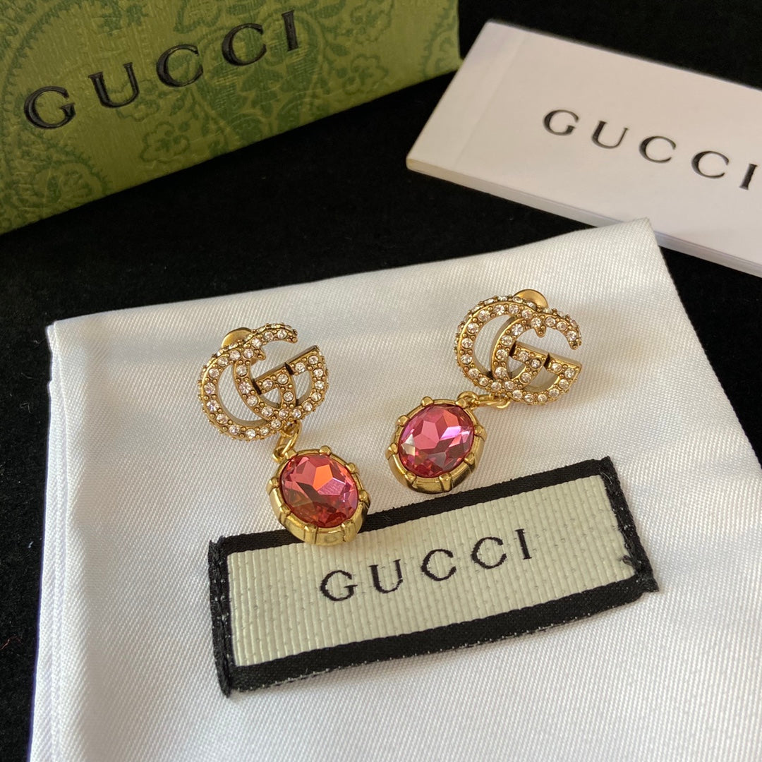 - A pink faceted crystal pendant with crystal double G detailing creates a sparkling pendant look especially in light and sunlight making these distressed gold-tone metal earrings dazzling.