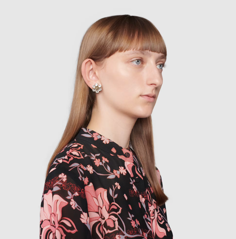 - A signature emblem of the House the initials of its Founder define these earrings. Adding a refined feel clear crystals frame the logo crafted from metal with an aged gold finish.
